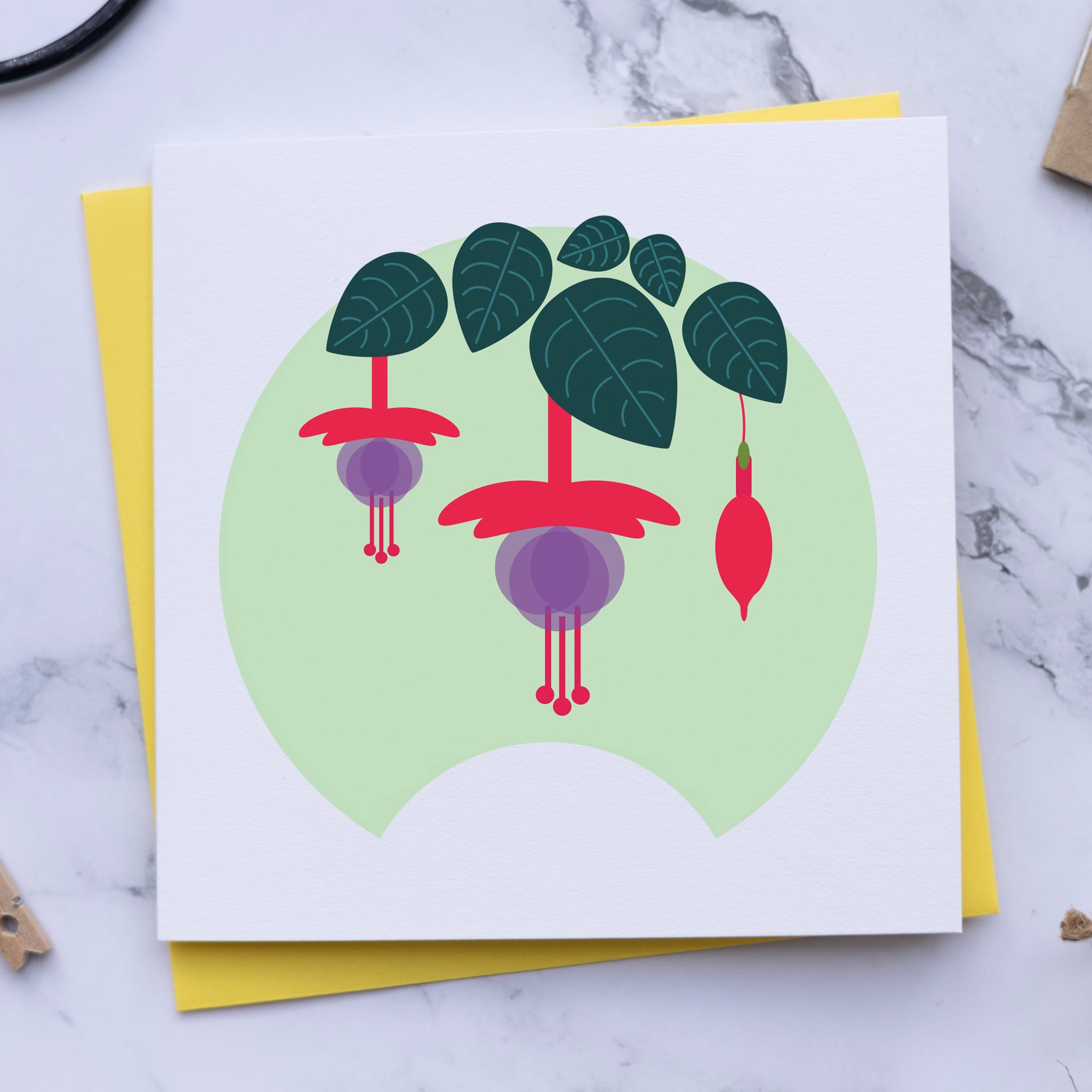 Introducing our Fuchsia small flower card, each measuring 125 x 125mm and adorned with unique geometric flower designs. Celebrating late summer into winter, the Fuchsia's lantern-like flowers that dangle gracefully with their bold, contrasting colors. They are the perfect flower for a friend representing good taste and thoughtfulness.