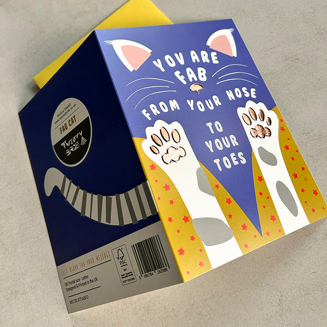 This Birthday card brings you extra special greetings with its rose gold foiled nose and paw pads. The front pictures a white cat's ears, nose and whiskers with the greeting message 'You are Fab, from your nose to your toes'. the paws are positioned in a playful stance bringing joy to any recipient. The design continues on the back showing the cat's tail.